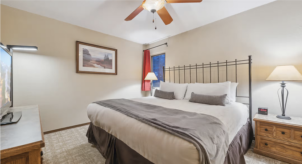 The 1 Bedroom suite can accommodate a maximum of 4 guests. The suite features a king bed in the bedroom, full-size sofa bed in the living room, one bathroom, full kitchen, and television.